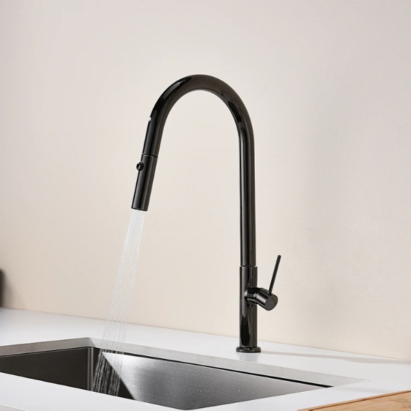 Grifos de caño alto para fregaderos profundos | Modelos con ducha extraíble para mayor funcionalidad | Griferías empotradas o de instalaciones en mural Acabados en negro mate, acero cepillado, oro cepillado o efecto cobre.