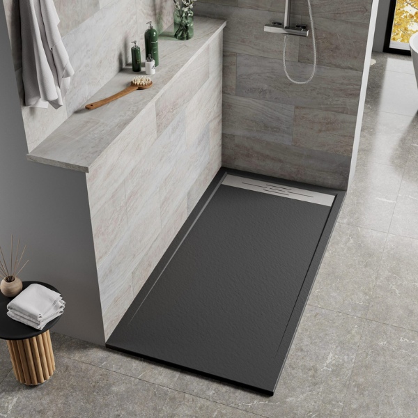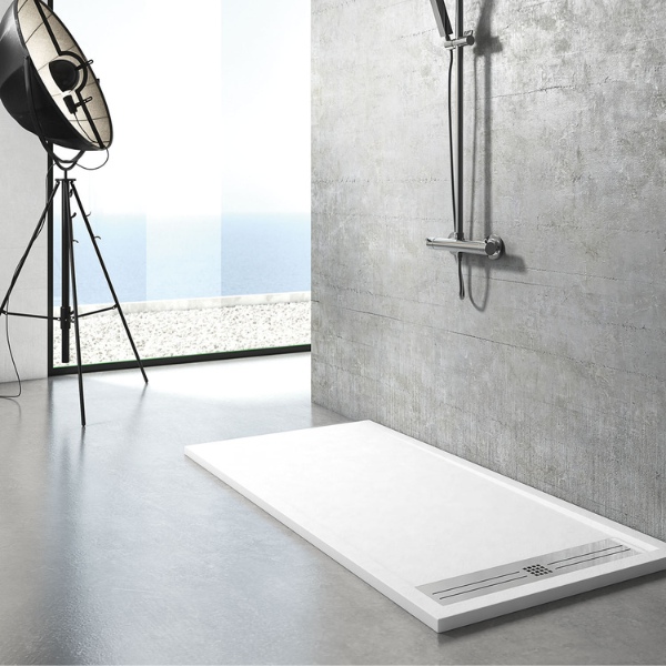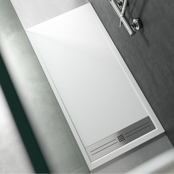 Platos de ducha de resina (3-4 cm) con textura pizarra. | Platos de ducha acrílico. | Platos de ducha de cerámica. | Platos de ducha de piedra extraplano (2cm) | Colores personalizables: blanco, gris, antracita, arena... | Formatos estándar o corte a medida. | Acabados antibacterianos y resistentes a químicos. | Accesorios: válvulas, rejillas inox y kits de instalación.